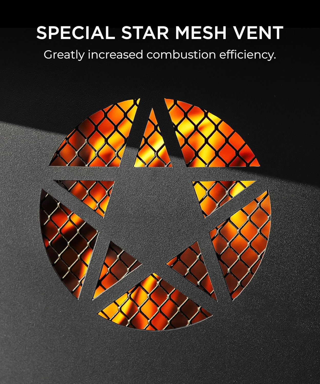 • 【MODERN & HUMANIZED DESIGN】The fire pit table comes with 1 height-adjustable 360° swivel grills which disassemble freely. You can barbecue, keep food warm or put pan to cook on them. The side of wood-burning fire pit is created with charming pentagram cut-out design which catches firelight for creating fun shadows. The drilled design promotes airflow and keeps the fire strong.