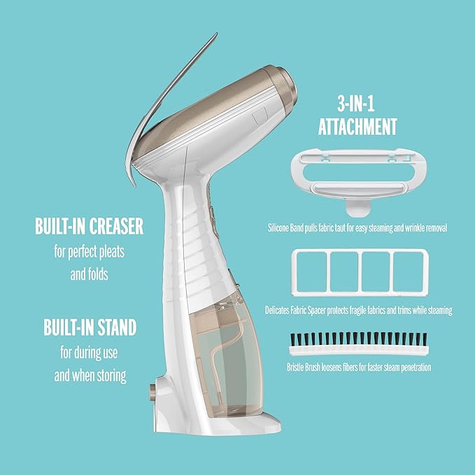 3-IN-1 ATTACHMENT: This portable steamer for clothes includes a silicone band to pull fabric taut for better results, a delicate fabric spacer to protect trims and fine fabrics, and a bristle brush to ensure steam penetrates fibers for a perfect press even on heavy fabrics.