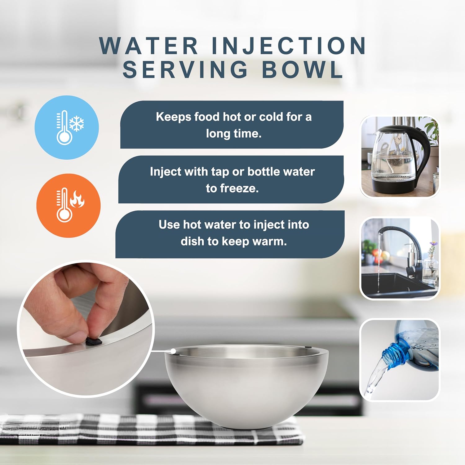 THERMAL WATER CHAMBER SERVING BOWL – A simple solution to serving food fresher and at the desired temperature. This double wall stainless steel dip chiller bowl can be injected with hot or cold water. For keeping food cold, add water from a tap or bottle and place it in the freezer. To keep food hot, add boiling hot water from a kettle.