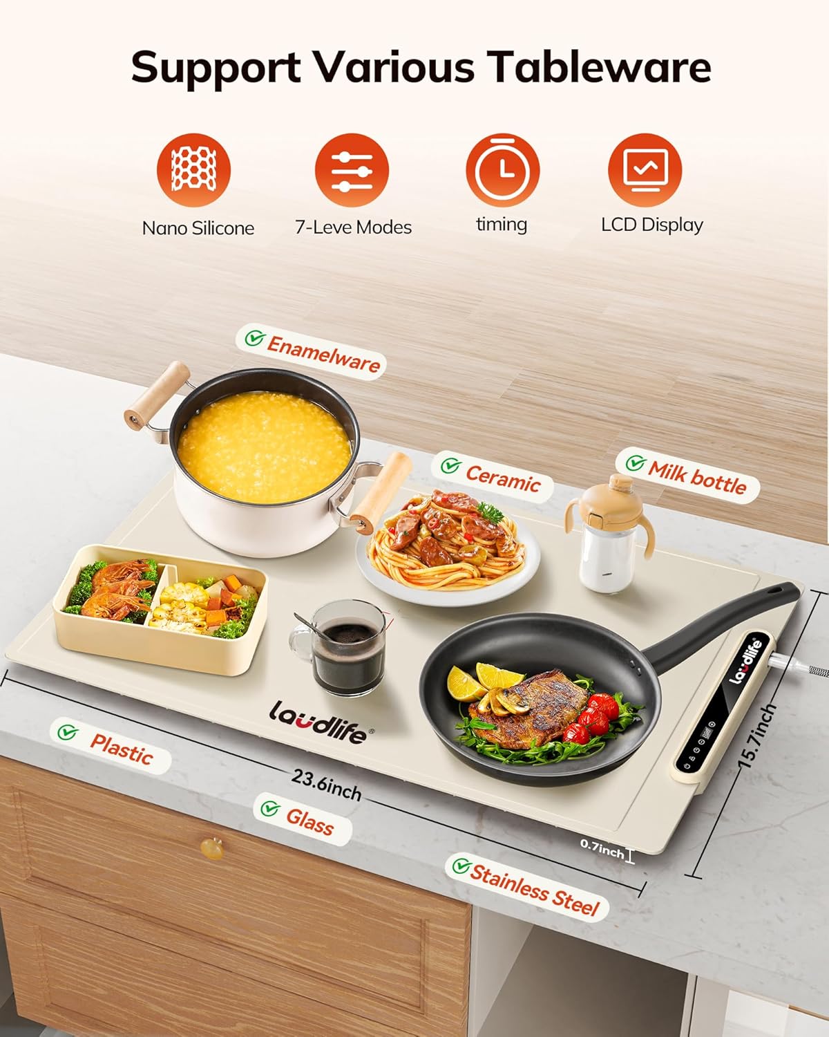 • 【Tip】Our warming tray’s bottom temperature only reaches 122°F, which is far below the fracture threshold of granite (around 572°F) and quartz (around 1598°F). However, for optimal care and to avoid any potential issues, we still recommend not using this product directly on granite or quartz countertops.