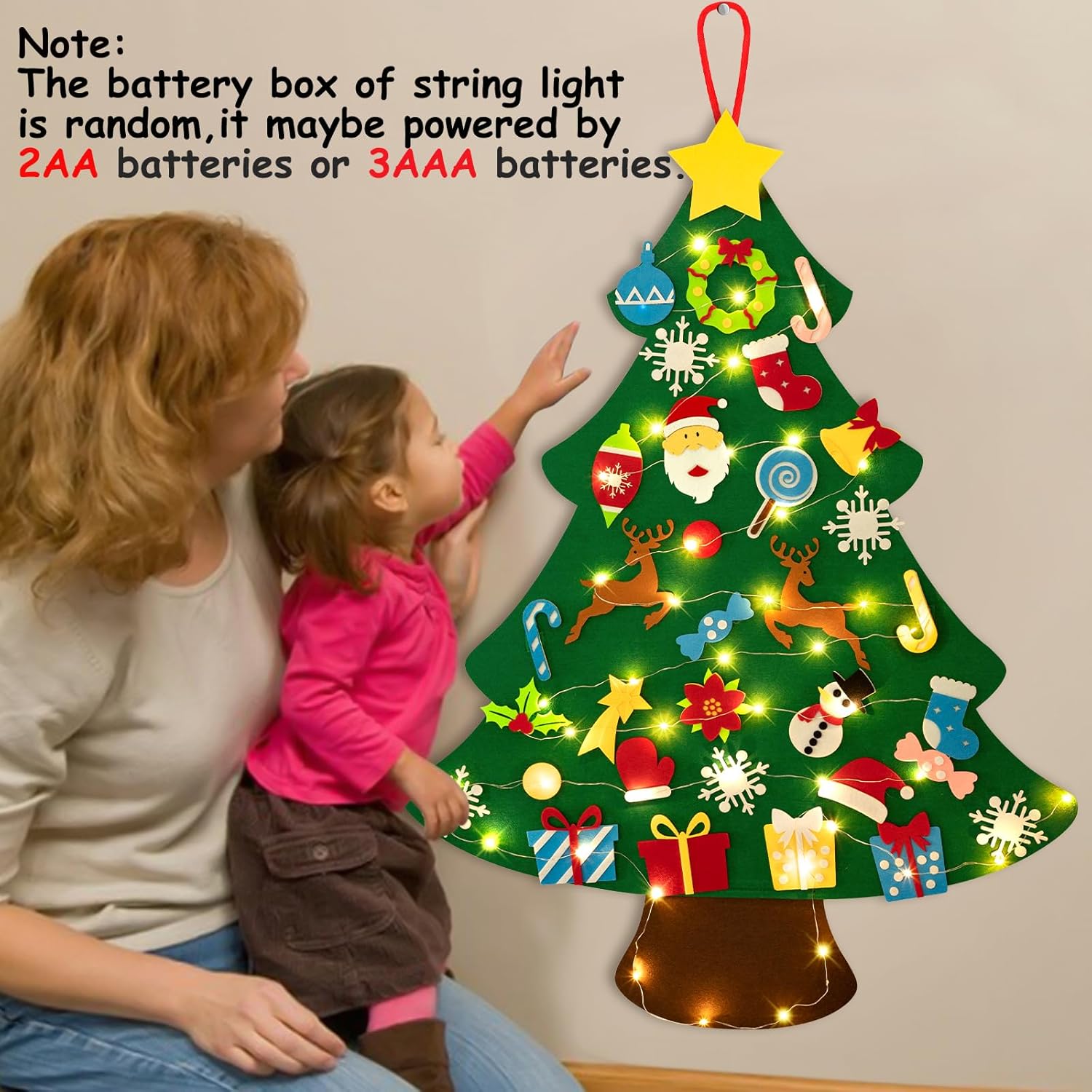 Package includes 1pcs DIY felt Christmas tree,33pcs ornament cutouts,1pcs red string and 1pcs snowman advent calendar.(gift)