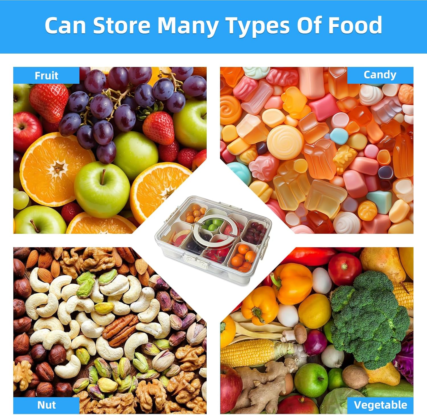Snackle Box Container 8-Section,Clear Divided Tray w/Secure Lid & Handle,Perfect Organizer for Fruits, Veggies, Candy & Charcuterie,Dishwasher Safe,Ideal for Travel, Parties & Picnics!(1)
