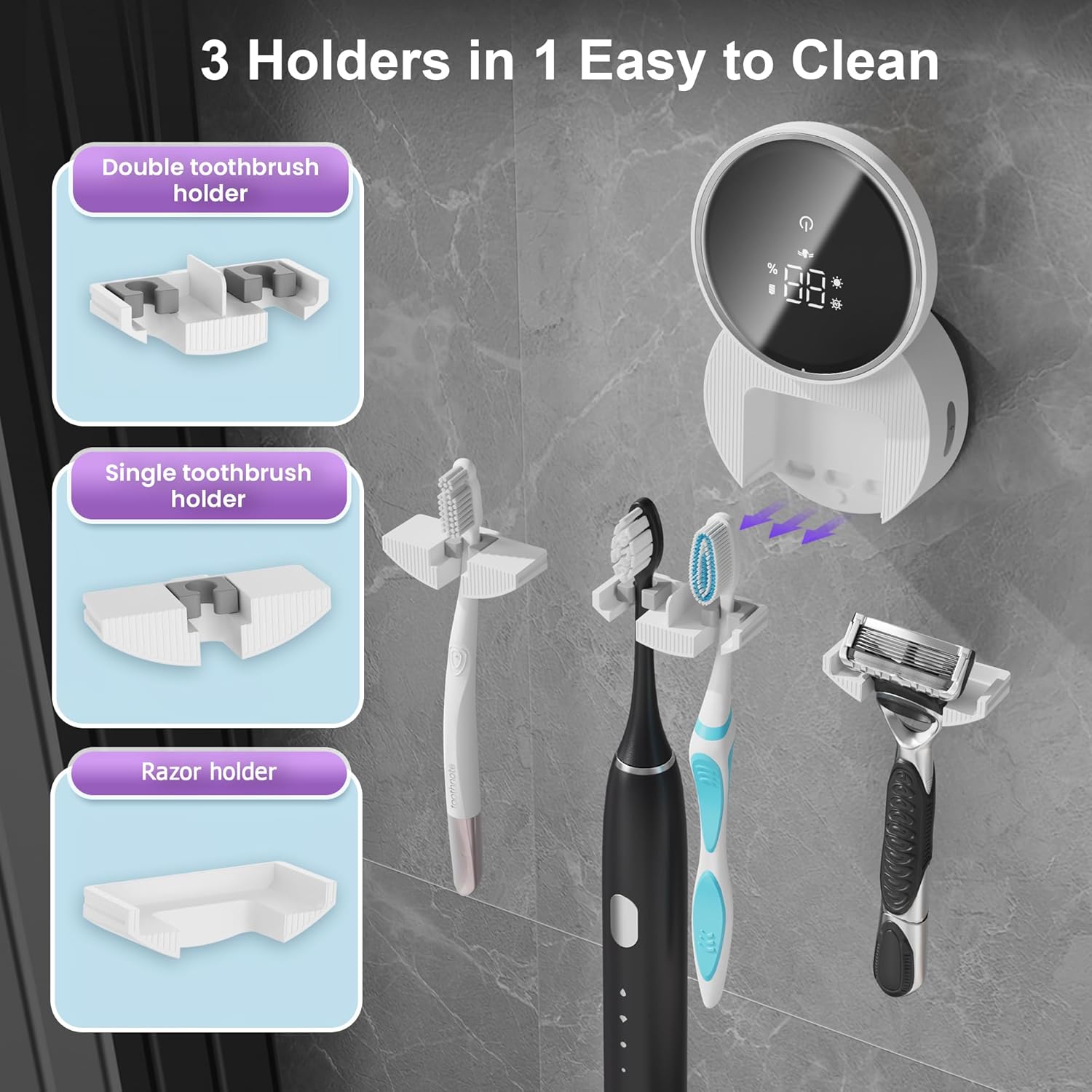 • Easy Switching/Washing – The product comes with three accessories that can be easily switched between a single toothbrush holder, a double toothbrush holder, and a manual razor holder. The accessories can be cleaned separately