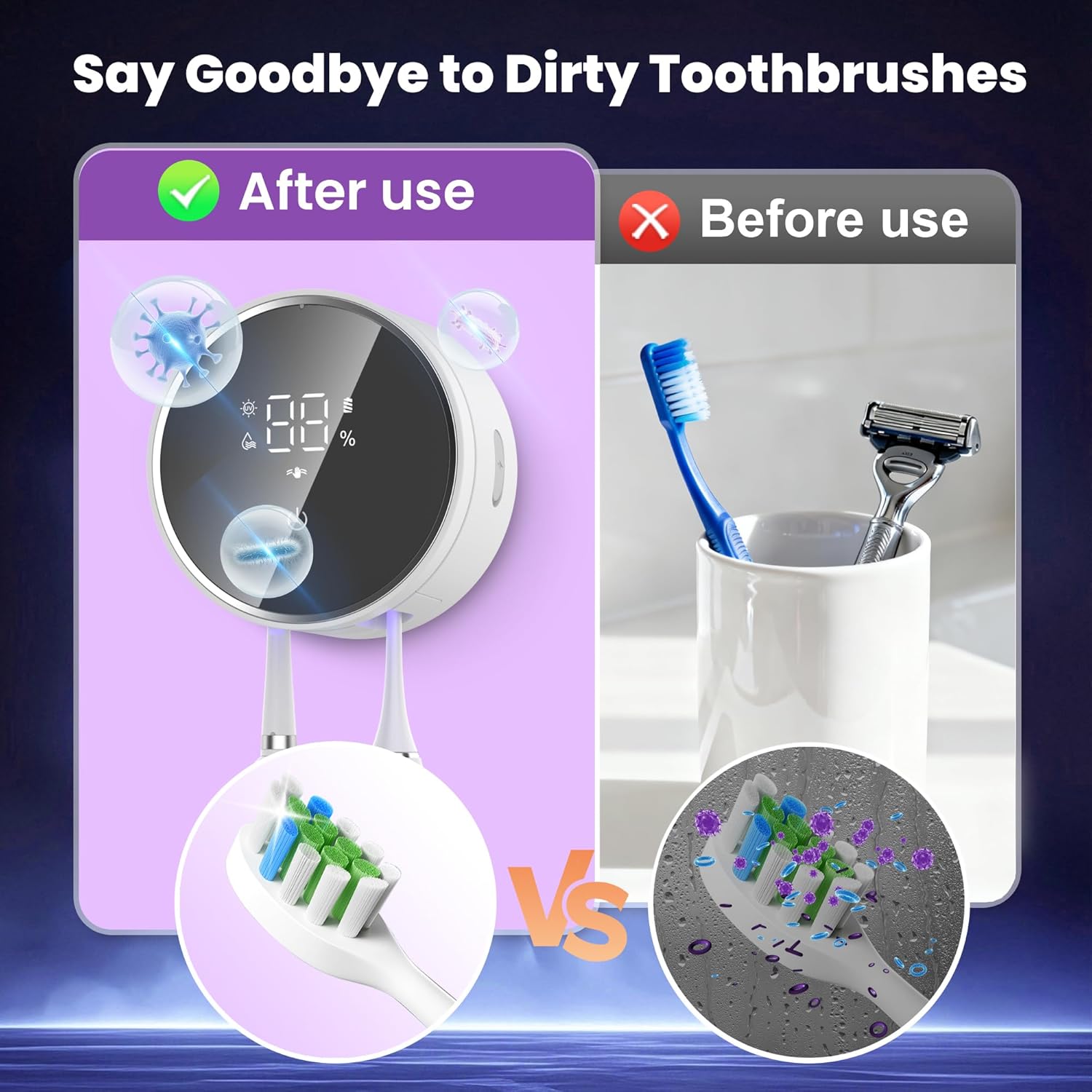 • Toothbruhs/Razor Cleaning/Drying – The product has a built-in cleaning light that automatically cleans every 4 hours, ensuring that your toothbrush is clean every time you use it.The product has a built-in heating plate 140°F to dry water on toothbrushes and razors. The drying function requires a power connection